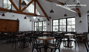 Balok kayu di langit-langit berpadu dengan pintu geser kayu besar di sisi ruangan, menciptakan perpaduan antara kesan industrial dan rustic yang elegan.