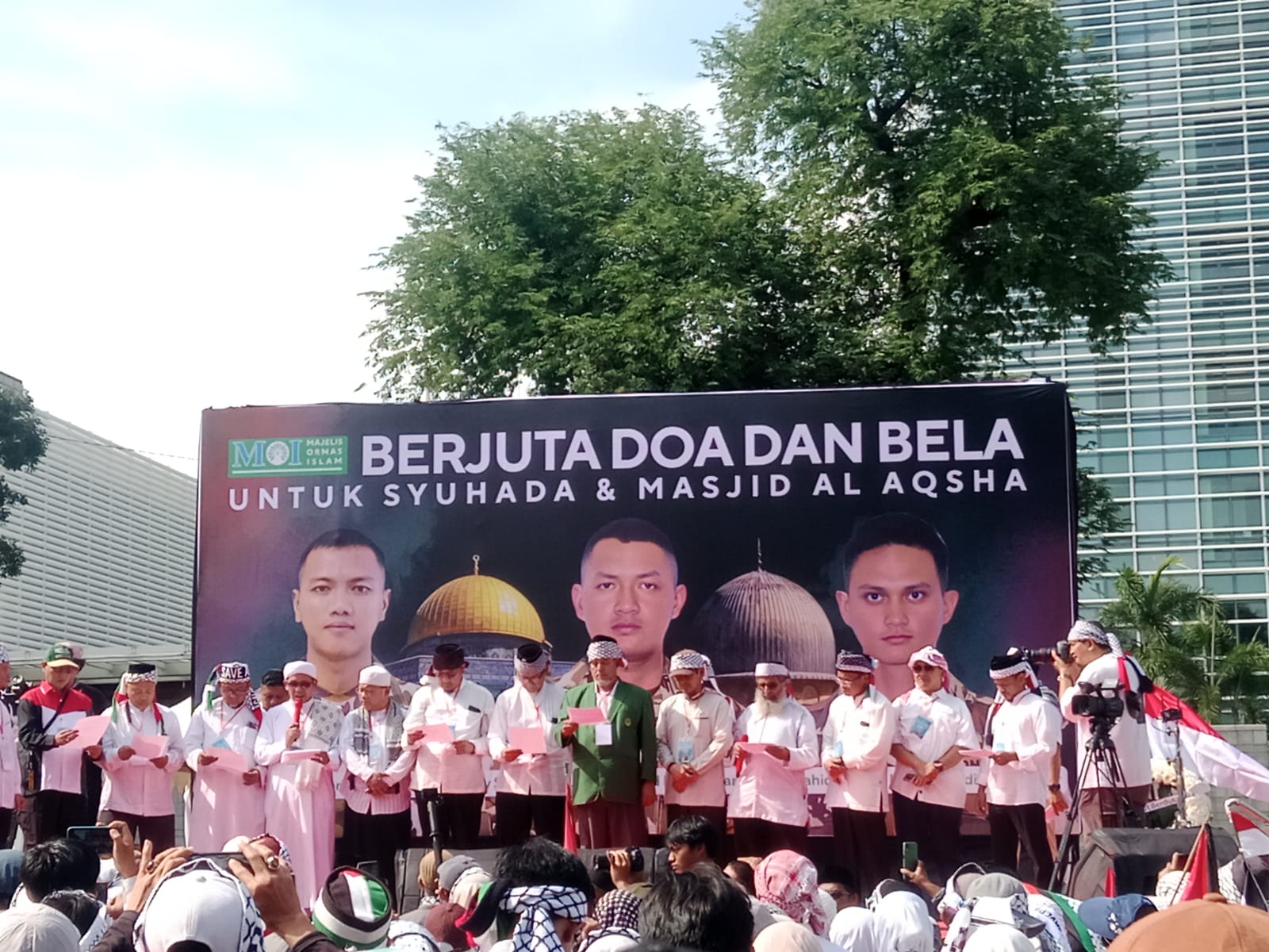 Mereka berkumpul untuk memanjatkan doa serta menyuarakan dukungan terhadap para syuhada, termasuk tiga prajurit TNI yang gugur saat menjalankan misi perdamaian United Nations Interim Force in Lebanon (UNIFIL) di Lebanon Selatan.